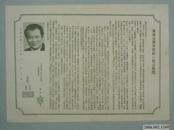 第8屆臺南市市長候選人蘇南成「再致臺南市民的一封公開信」選舉宣傳單