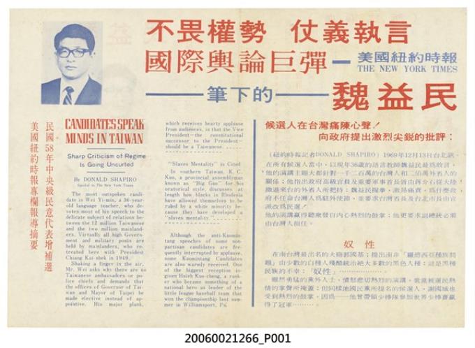 中華民國臺灣省議員候選人魏益民「不畏權勢 仗義執言」選舉宣傳單
