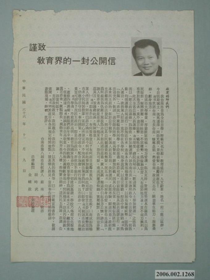 第8屆臺南市市長候選人蘇南成「謹致教育界的一封公開信」選舉宣傳單
