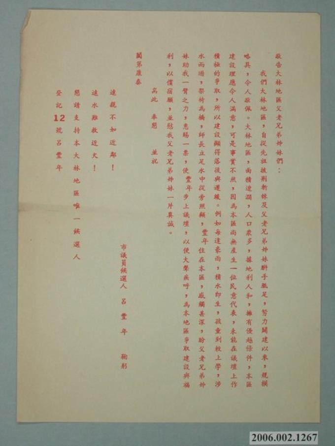 臺南市第9屆市議員候選人呂豐年選舉宣傳單