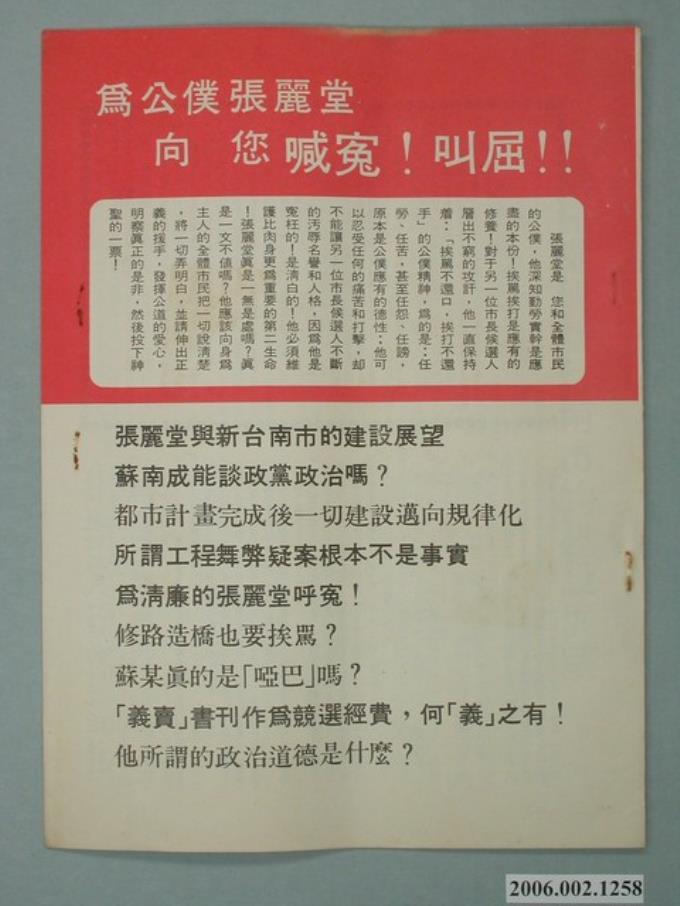 第8屆臺南市市長候選人張麗堂「為公僕張麗堂向您喊冤叫屈」選舉宣傳單