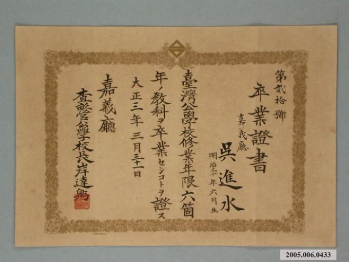 昭和17年臺南州知事核發曾文郡官田聯合壯丁團副團長陳南山幹部練成講習會結業證書