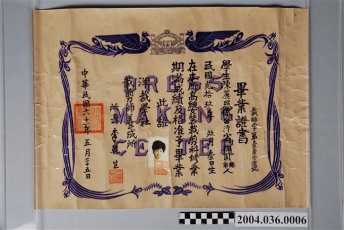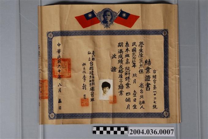 民國60年陳麗照臺北縣私立臺都縫紉短期職業補習班結業證書