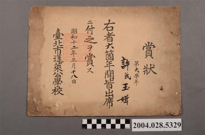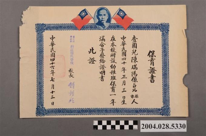 新莊國民學校附設幼稚班陳瑞陽保育證書