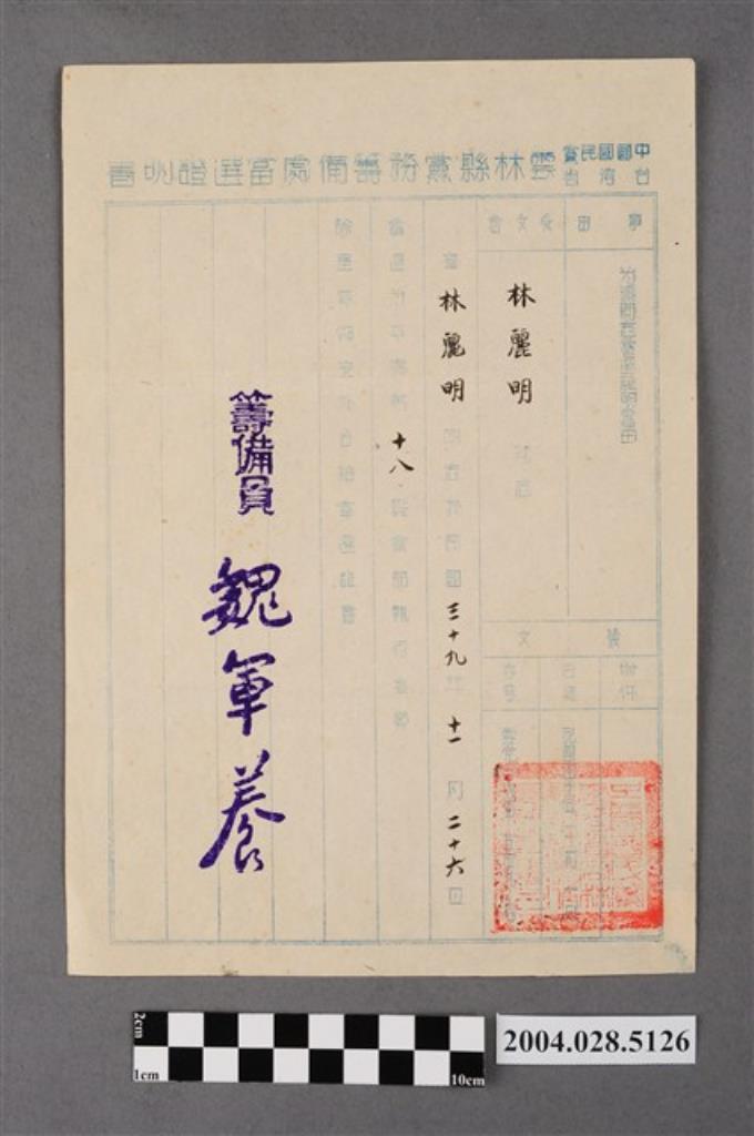 林麗明受聘國民黨雲林縣委員會第16區黨部紀律委員會委員聘書函