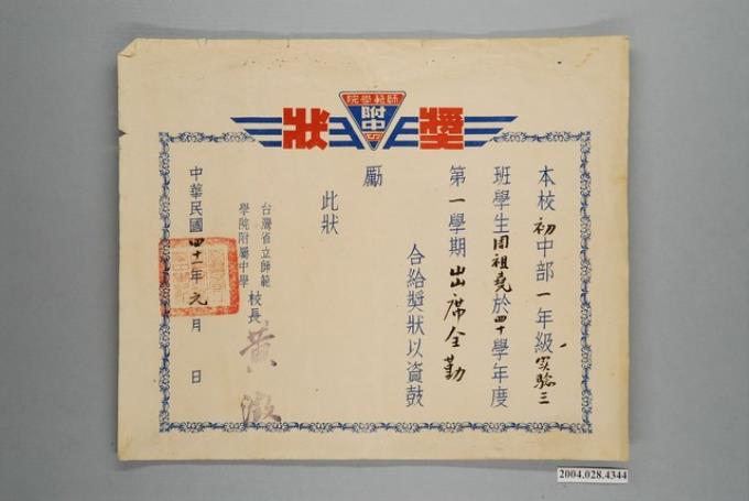 周祖堯臺灣省立臺北師範學校附屬小學全勤獎狀