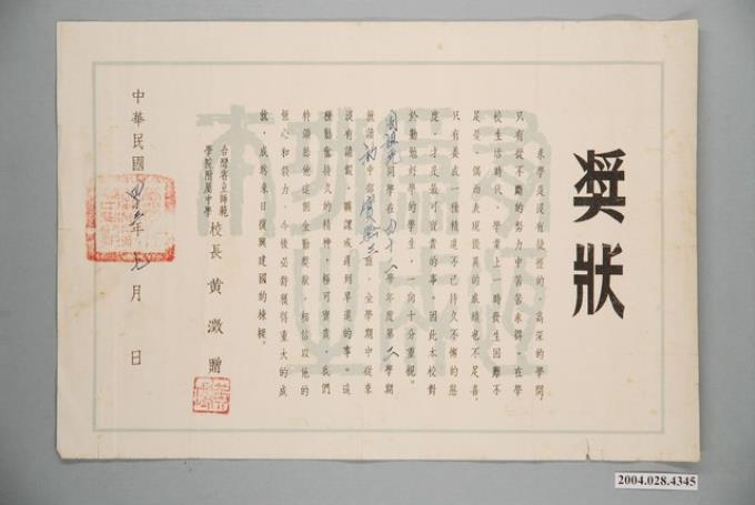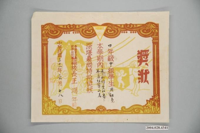 周祖堯臺灣省立臺北師範學校附屬小學獎狀