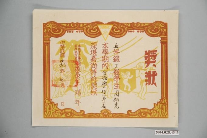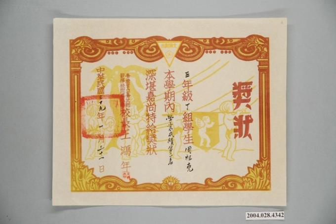 周祖堯臺灣省立臺北師範學校附屬小學成績優良獎狀