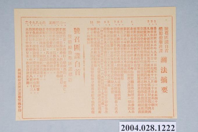 桃園縣檢肅匪諜運動宣傳會印《號召匪諜自首 獎勵檢舉匪諜辦法摘要》宣傳單