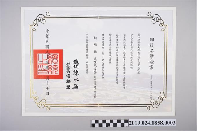 柯旗化回覆名譽證書
