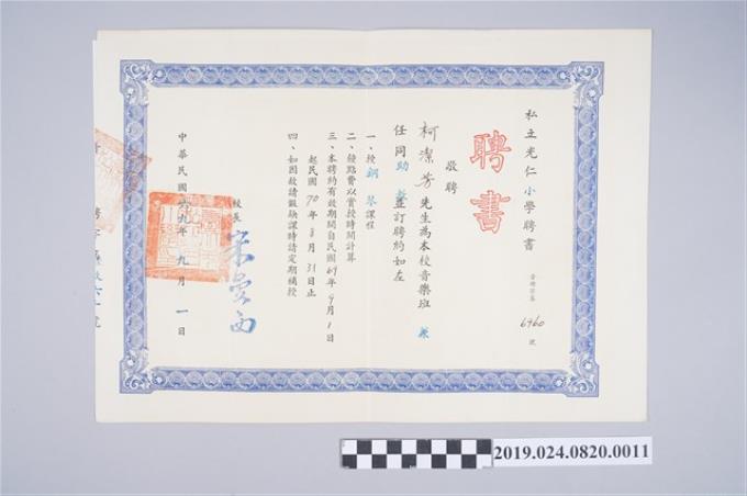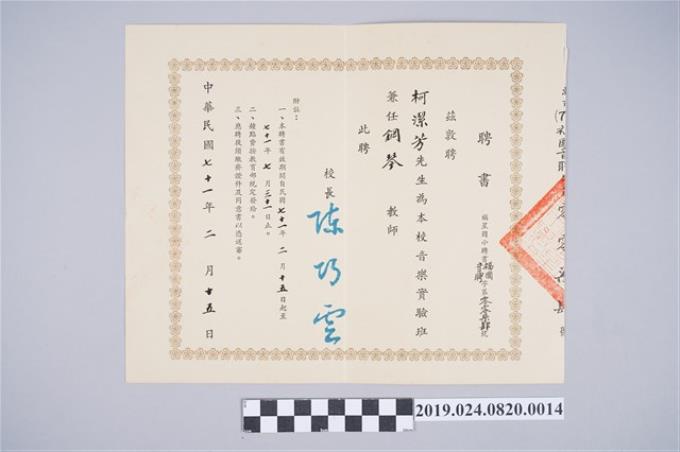 1982年柯潔芳私立光仁小學音樂幼年班兼任助教聘書