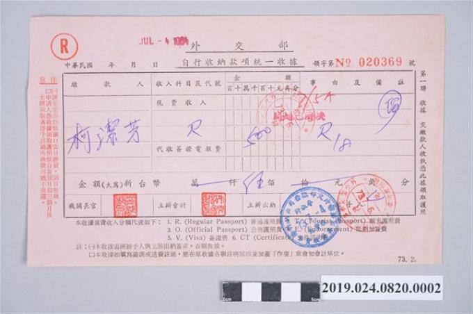 外交部普通護照費規費收據