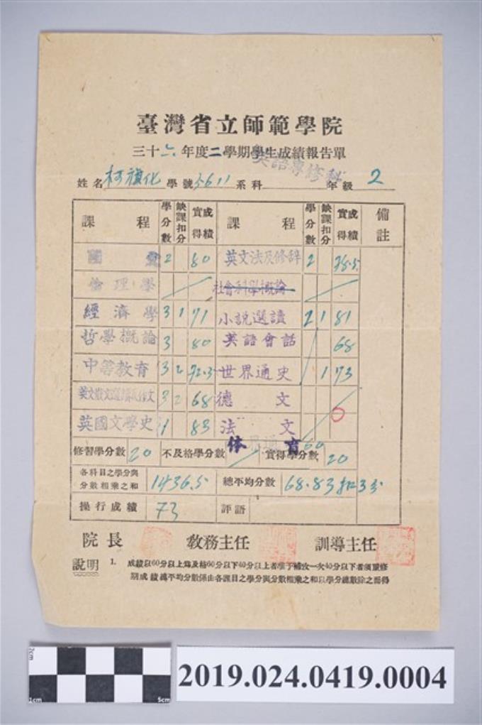 1947年柯旗化台灣省立師範學院英語科二年級第一學期成績報告單