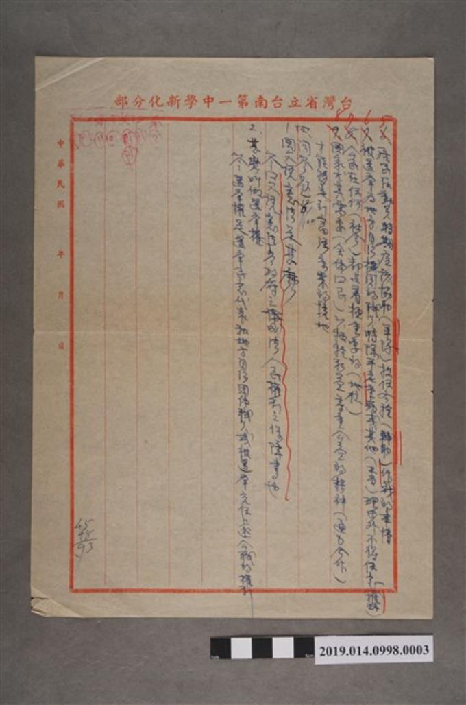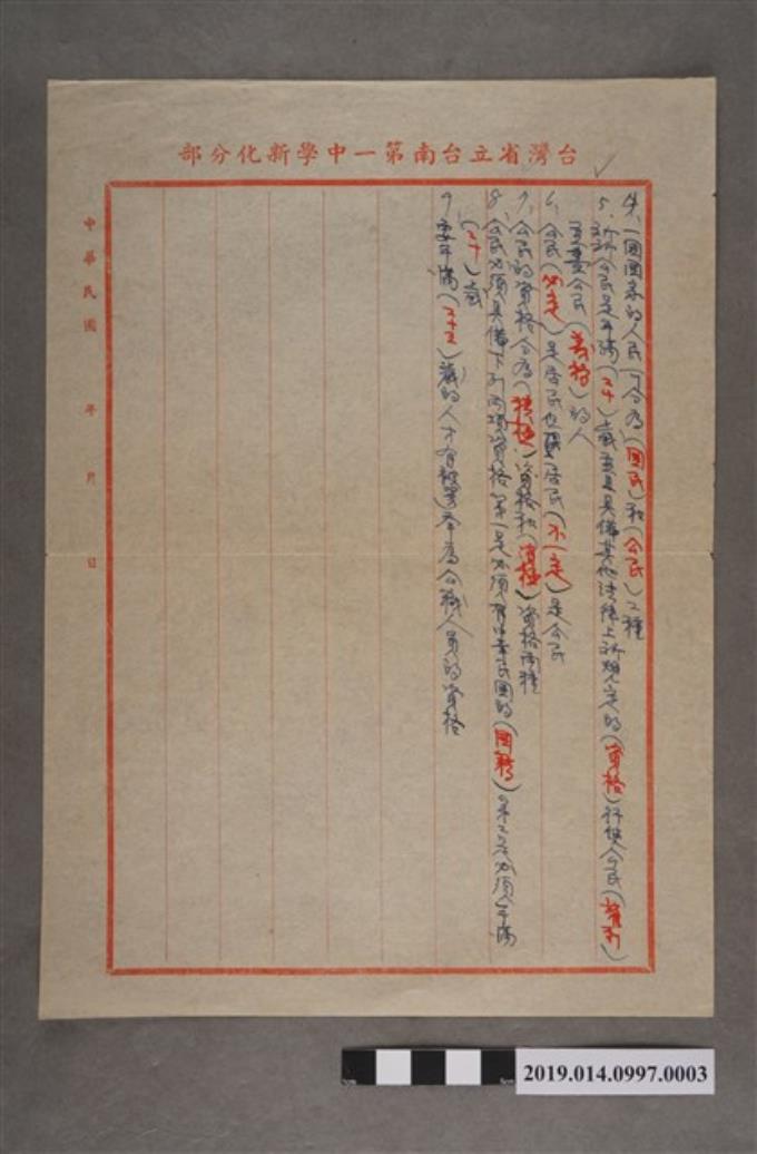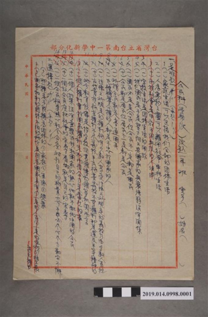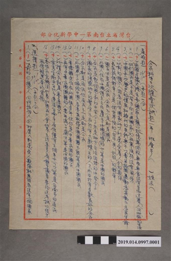 臺灣省立臺南第一中學新化分部一年級公民科學期考命題試卷