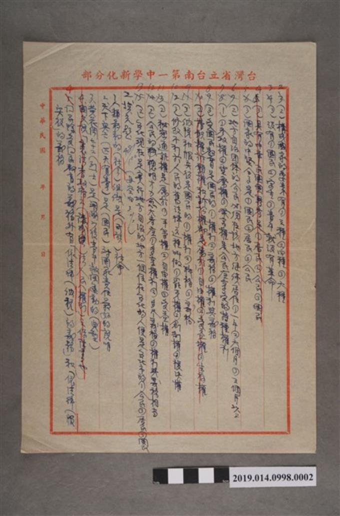 臺灣省立臺南第一中學新化分部一年級公民科學期考命題試卷第2頁(選擇題、填充題)