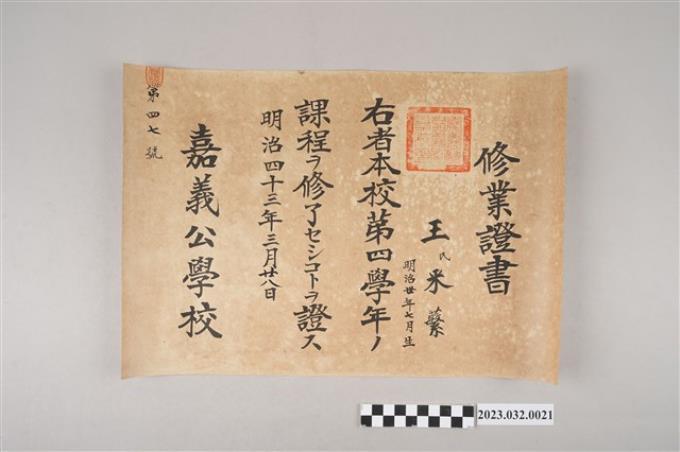明治43年3月28日王采蘩嘉義公學校第四學年修業證書