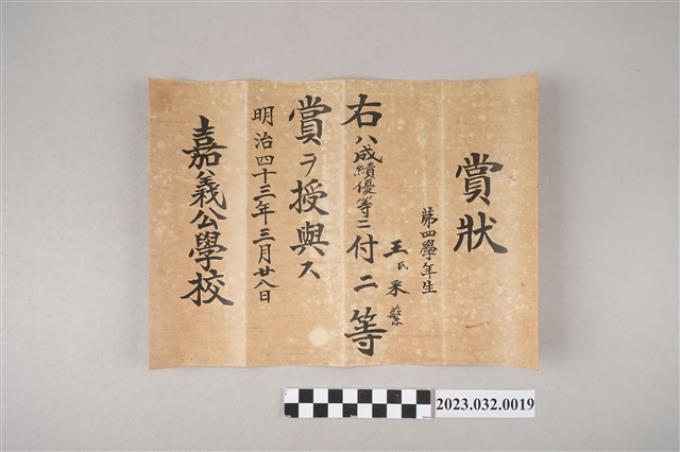 明治43年3月28日王采蘩嘉義公學校第四學年勤學獎狀