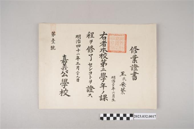明治41年3月29日王采蘩嘉義公學校第二學年修業證書