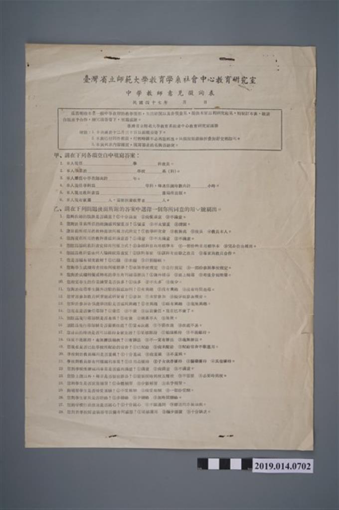 臺灣省師範大學教育學系社會中心教育研究室所印製〈中學教師意見徵詢表〉
