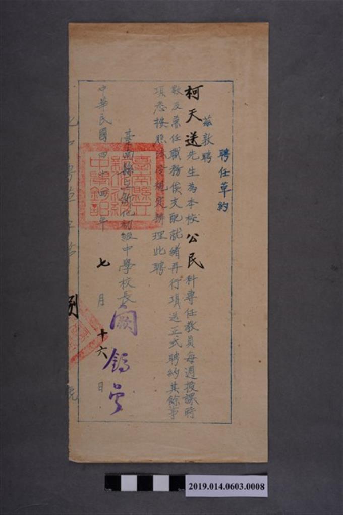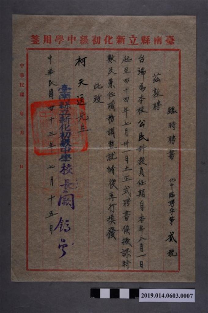 臺南縣立新化初級中學臨時聘書