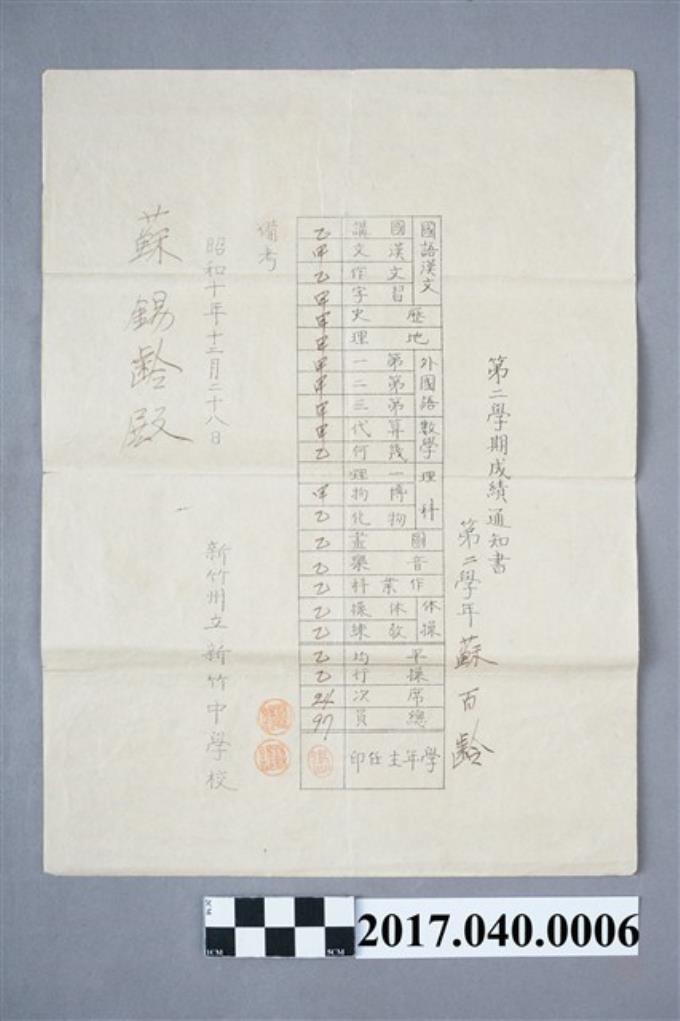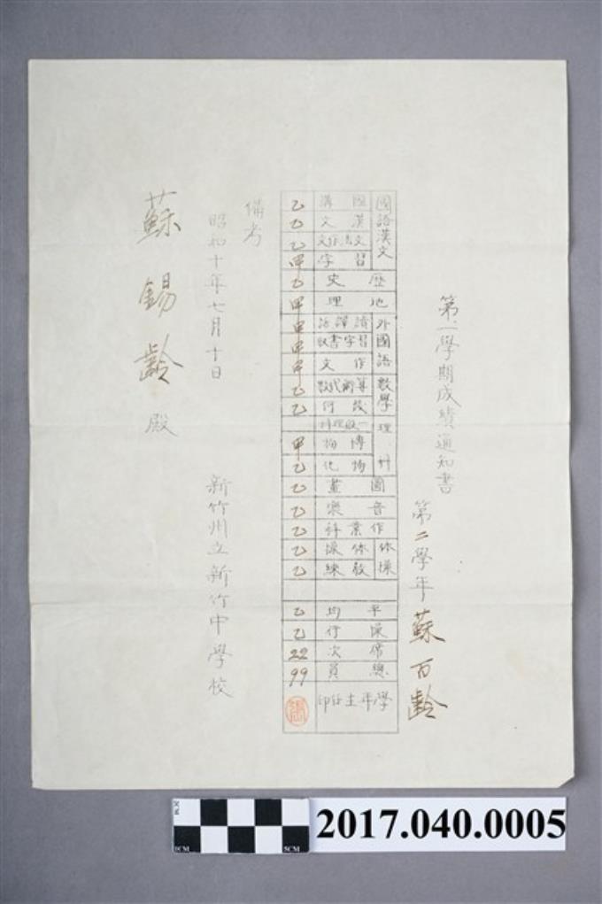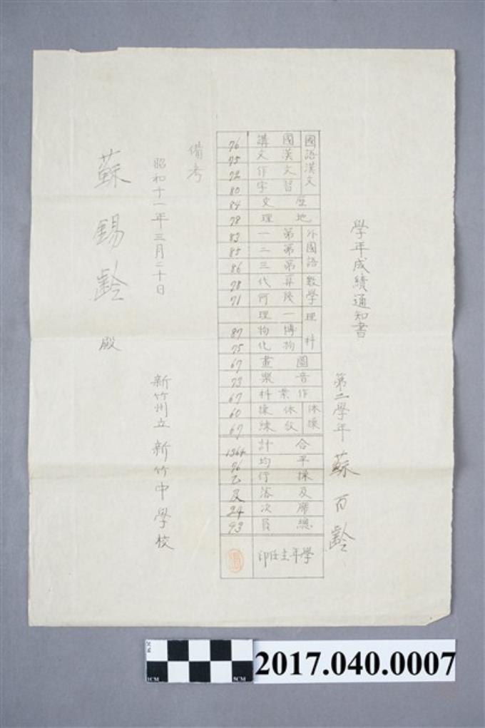 蘇百齡新竹州立新竹中學校第2學年學年成績通知書