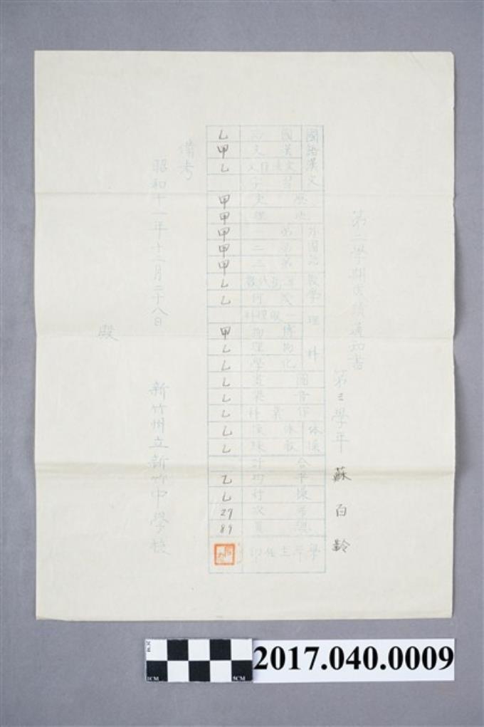 蘇百齡新竹州立新竹中學校第3學年學年成績通知書