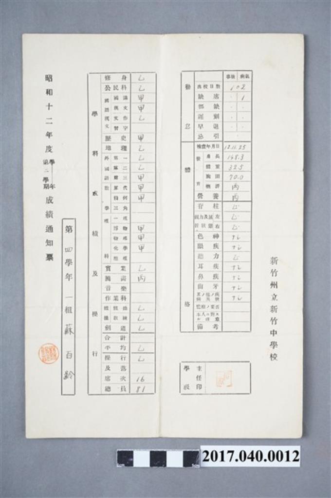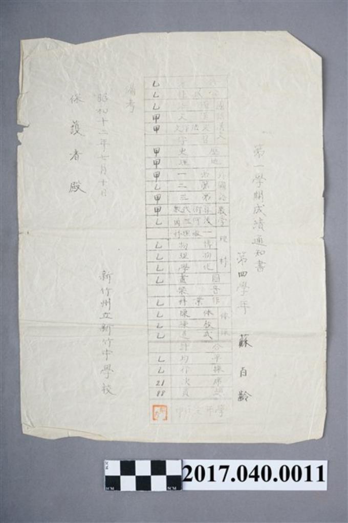 蘇百齡新竹州立新竹中學校第4學年第1學期成績通知書