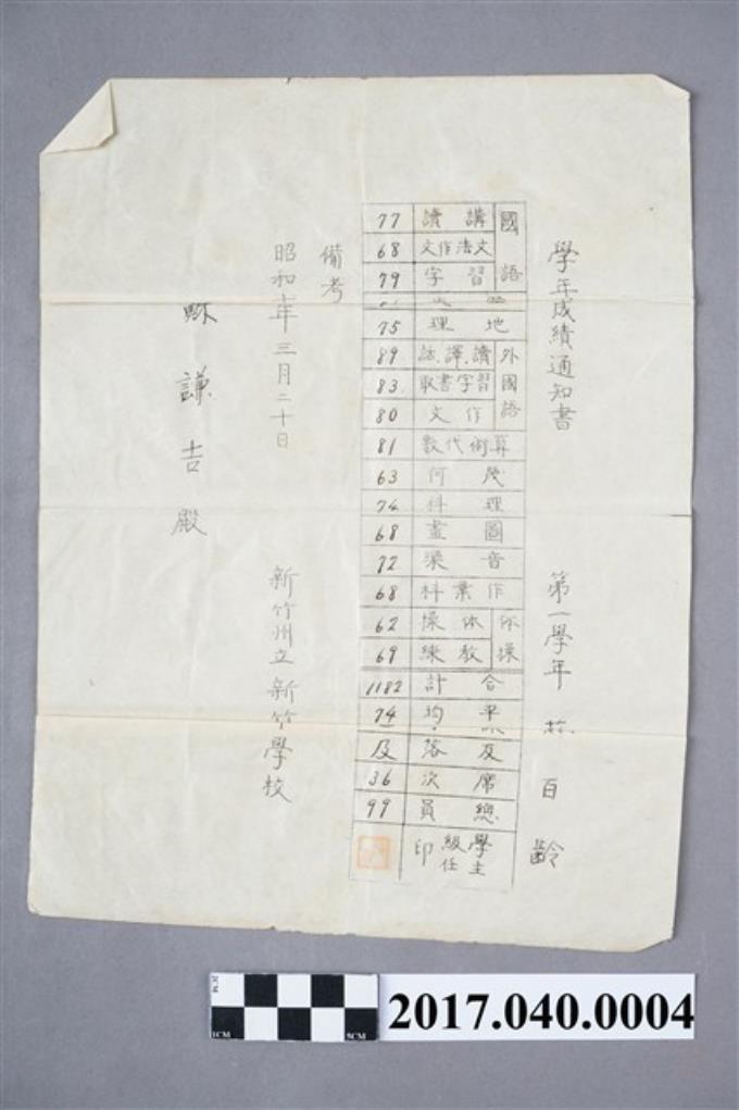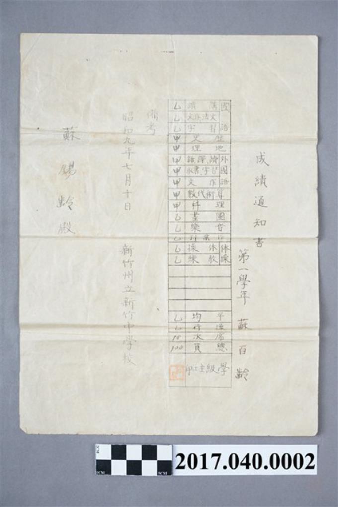 蘇百齡新竹州立新竹中學校第1學年成績通知書