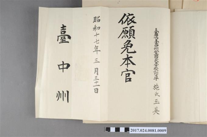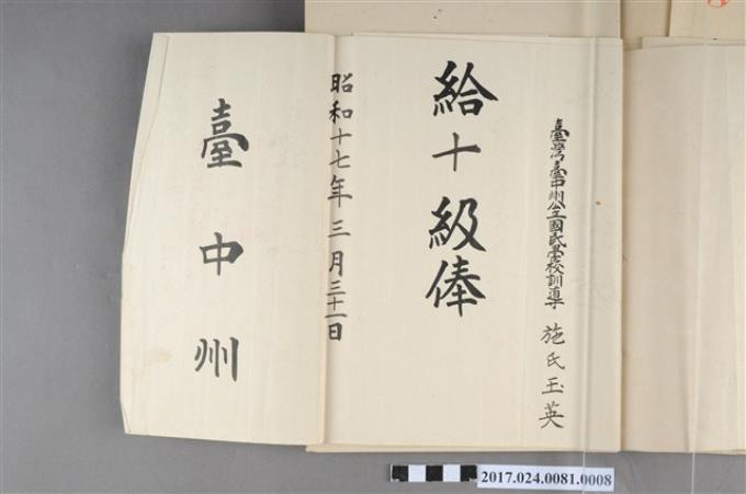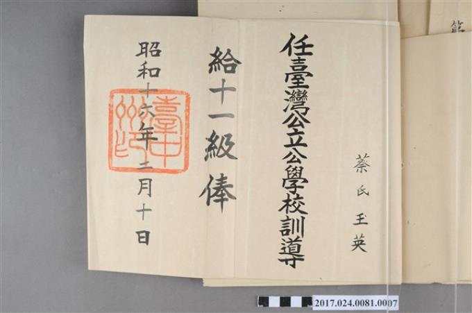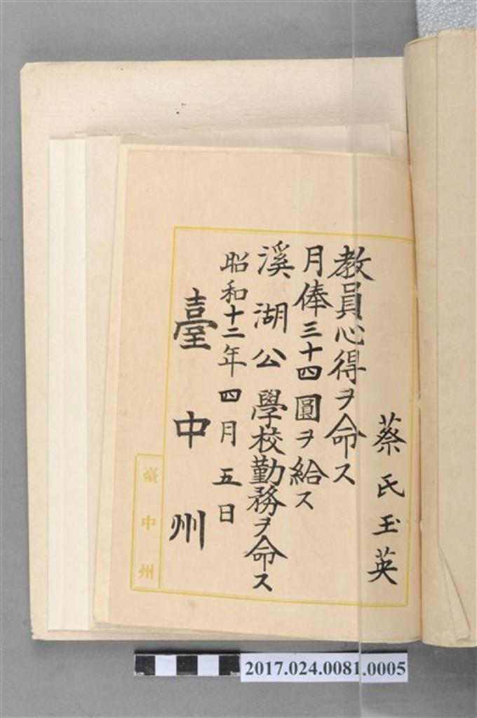 臺中州給蔡玉英臺灣公立公學校訓導俸給單