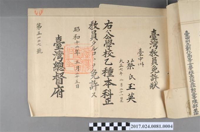 臺中州立彰化高等女學校給蔡玉英畢業證書