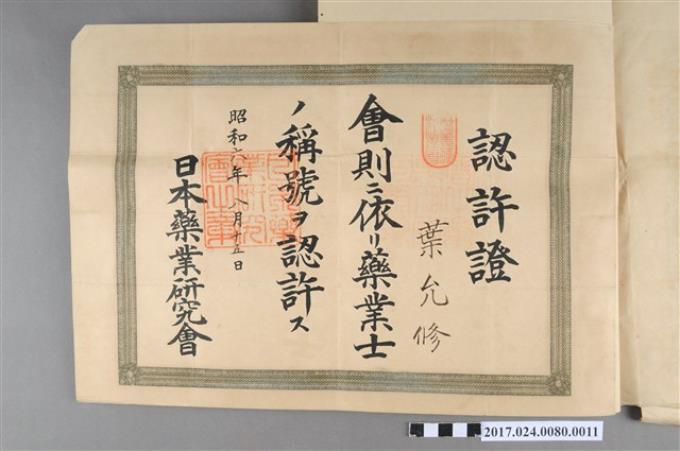 日本藥業研究會給葉允修認許證