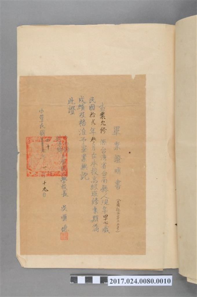 臺南縣新港鄉月眉國民學校給葉允修畢業證明書