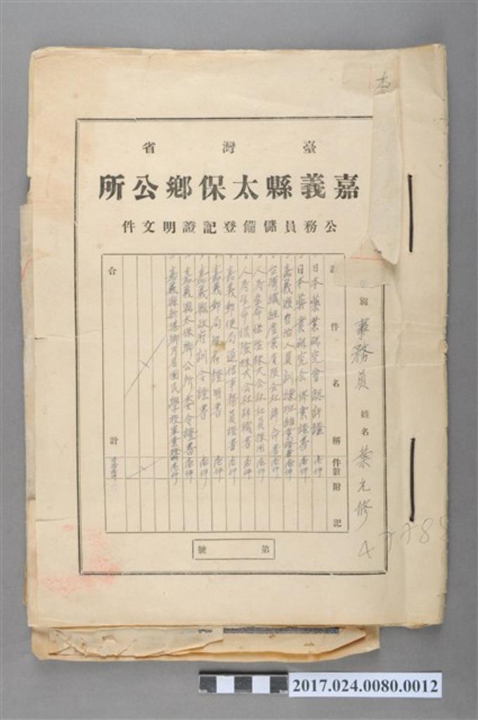 嘉義縣太保鄉公所公務員事務員葉允修儲備登記證明文件(封面)