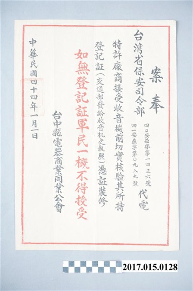 臺中縣電器商業同業公會收音機憑證裝修聲明公告