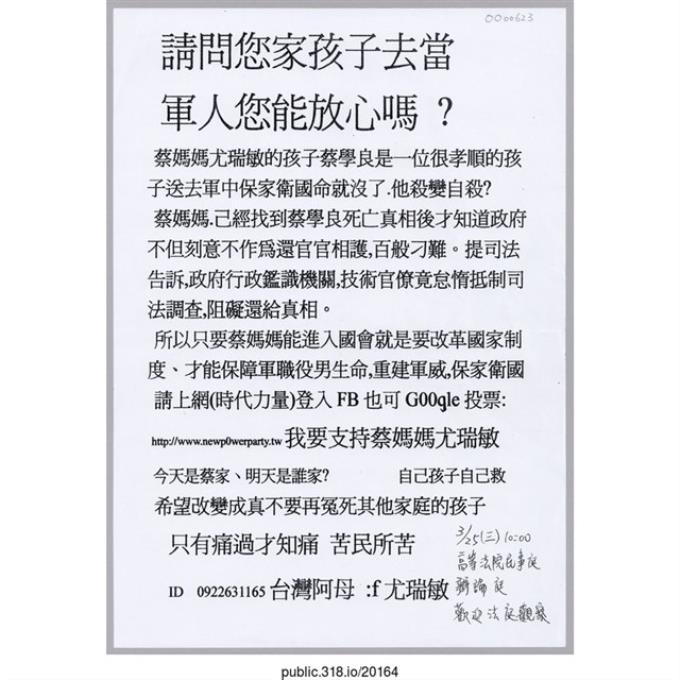 「請問您家孩子去當軍人您能放心嗎?」傳單