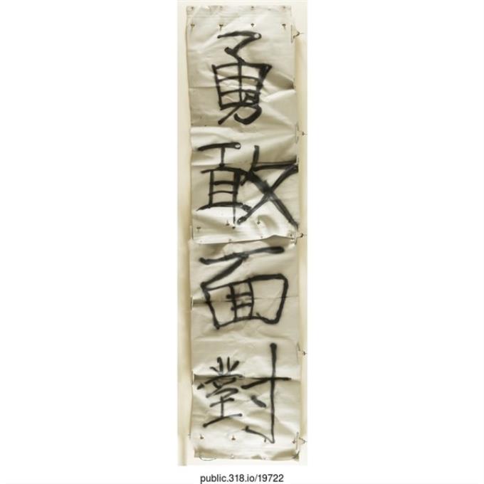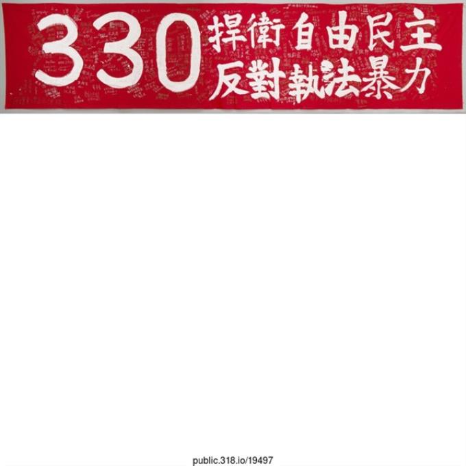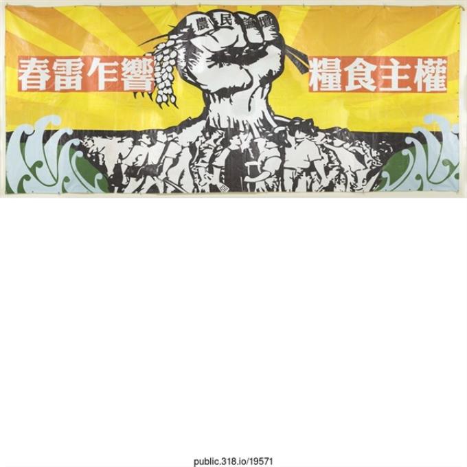 「春雷乍響糧、食主權」、「同胞須團結、團結真有力」手繪布條