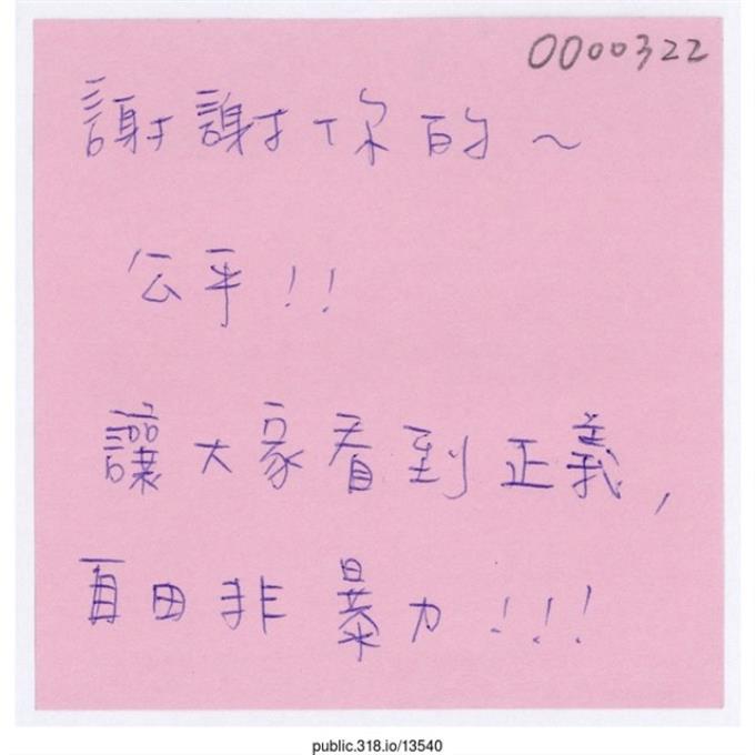 「謝謝你們讓我的爸媽能夠看見真正的事實」便利貼