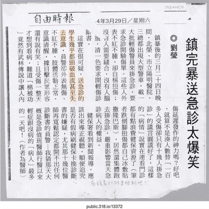 「鎮暴完送急診太爆笑」報紙
