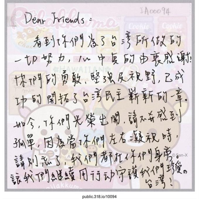 「讓我們繼續用行動守護我們珍愛的台灣!」便利貼