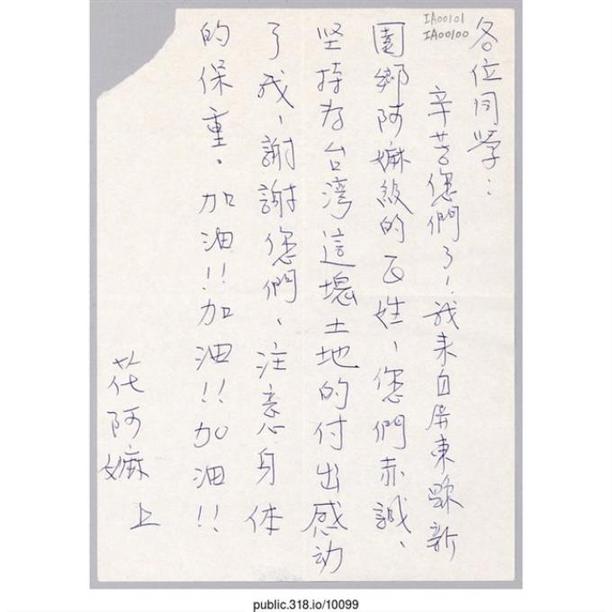 屏東縣新園鄉花阿嬤「辛苦您們了!」信紙