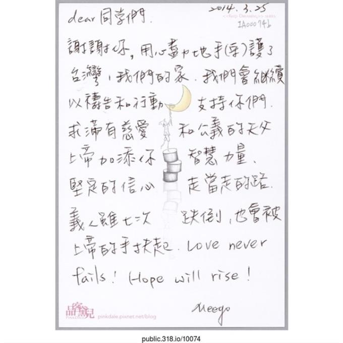 Meego「我們會繼續以禱告和行動支持你們」明信片