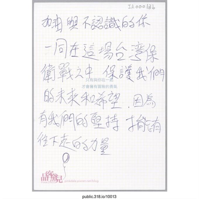 「加油與不認識的你一同在這場台灣保衛戰之中」明信片