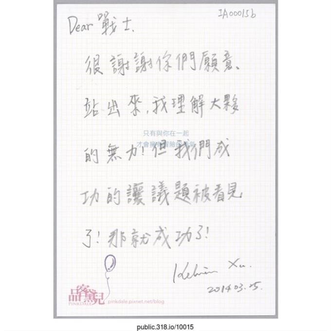 勁瑋「謝謝你們讓更多人知道服貿的議題」明信片