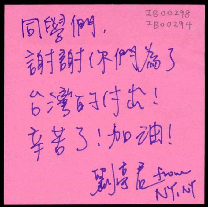 劉亭君「謝謝你們為了台灣的付出!」便利貼