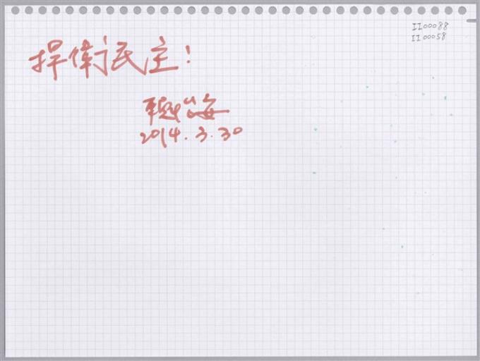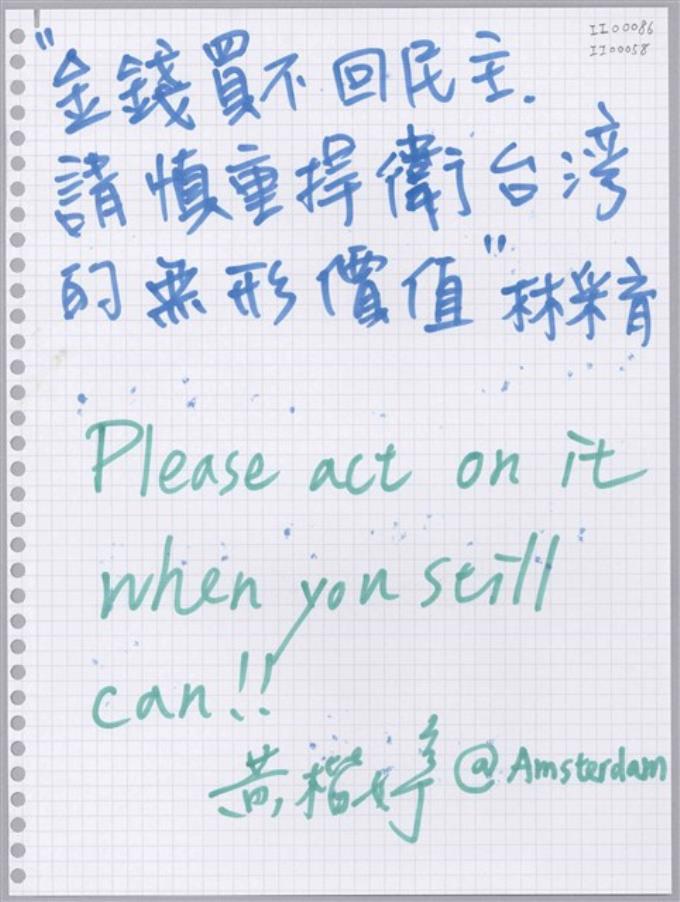 林采育;黃楷婷「金錢買不回民主。」活頁紙