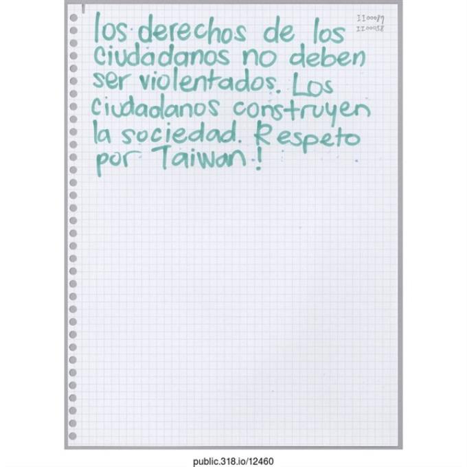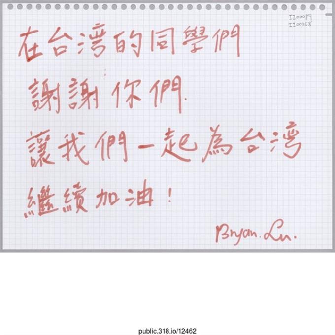 Bryan Lin「在台灣的同學們謝謝你們。」活頁紙