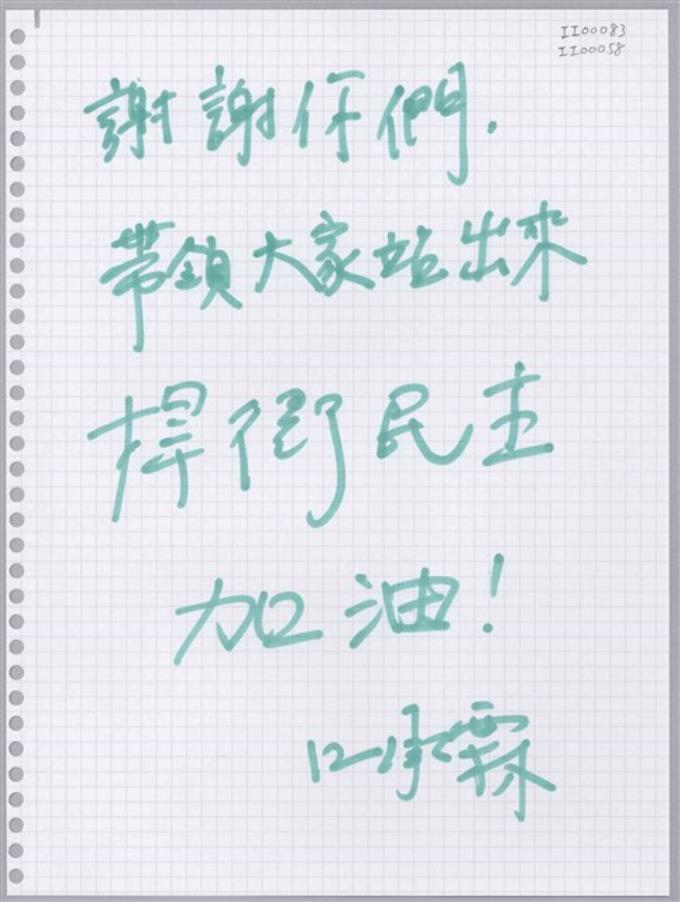 江承霖「帶領大家站出來捍衛民主」活頁紙