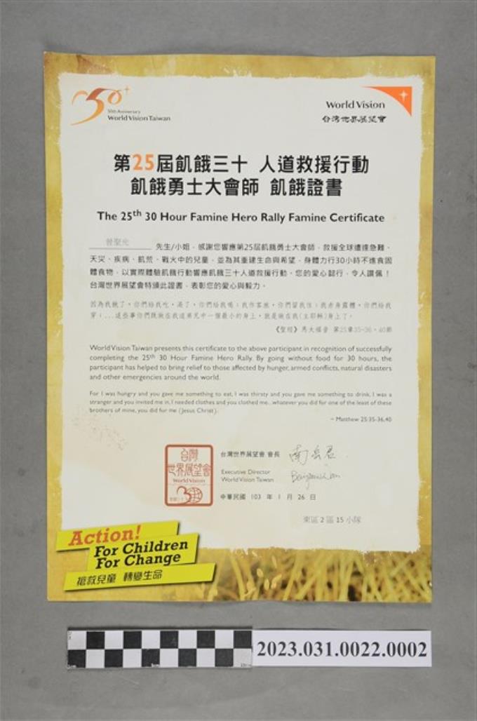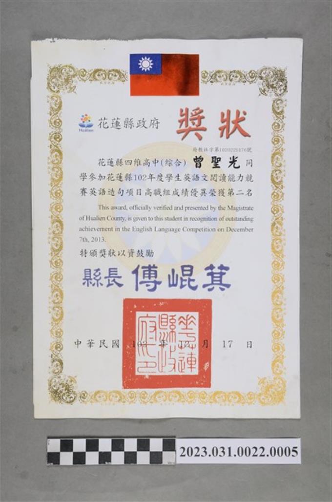 曾聖光102年度英語文閱讀能力競賽第二名獎狀