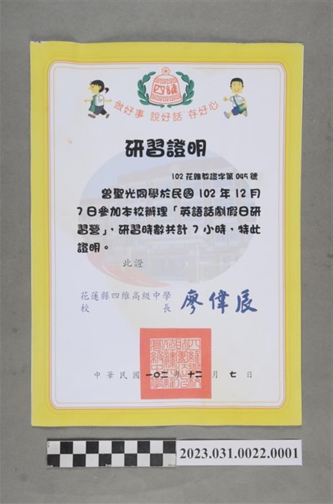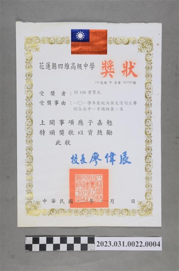 曾聖光四維高中101學年度英文造句比賽第一名獎狀