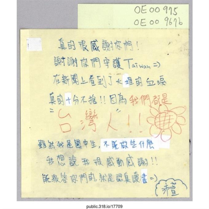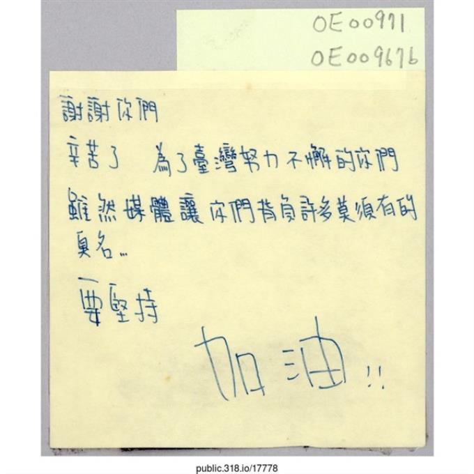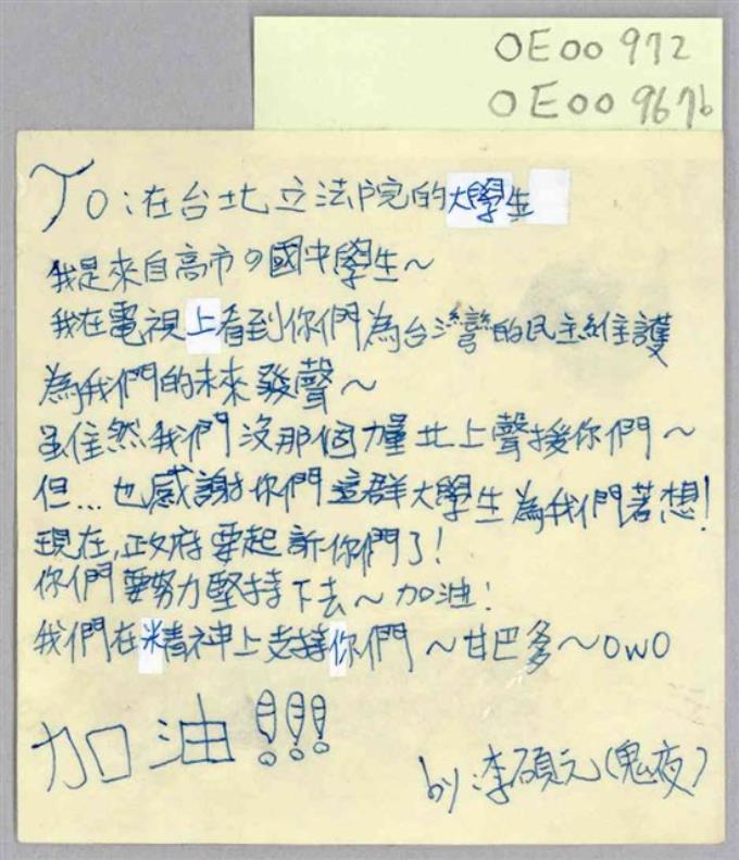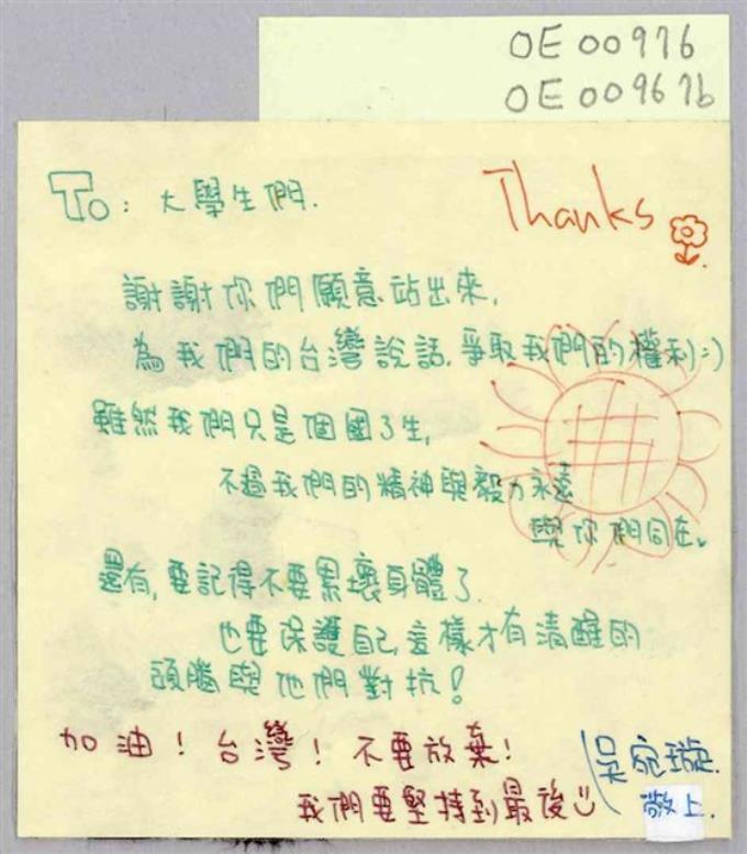 李碩元「To:在台北立法院的大學生」便利貼